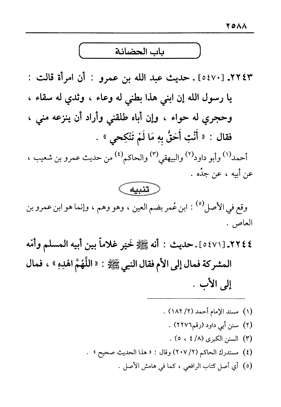 2244 - [5471]- حديث: أنه - صلى الله عليه وسلم - خَيّر غلامًا بين أبيه المسلم وأمّه المشركة فمال إلى الأم فقال النبي - صلى الله عليه وسلم -: "اللهُمَّ اهْدِهِ"، فمال إلى الأب.