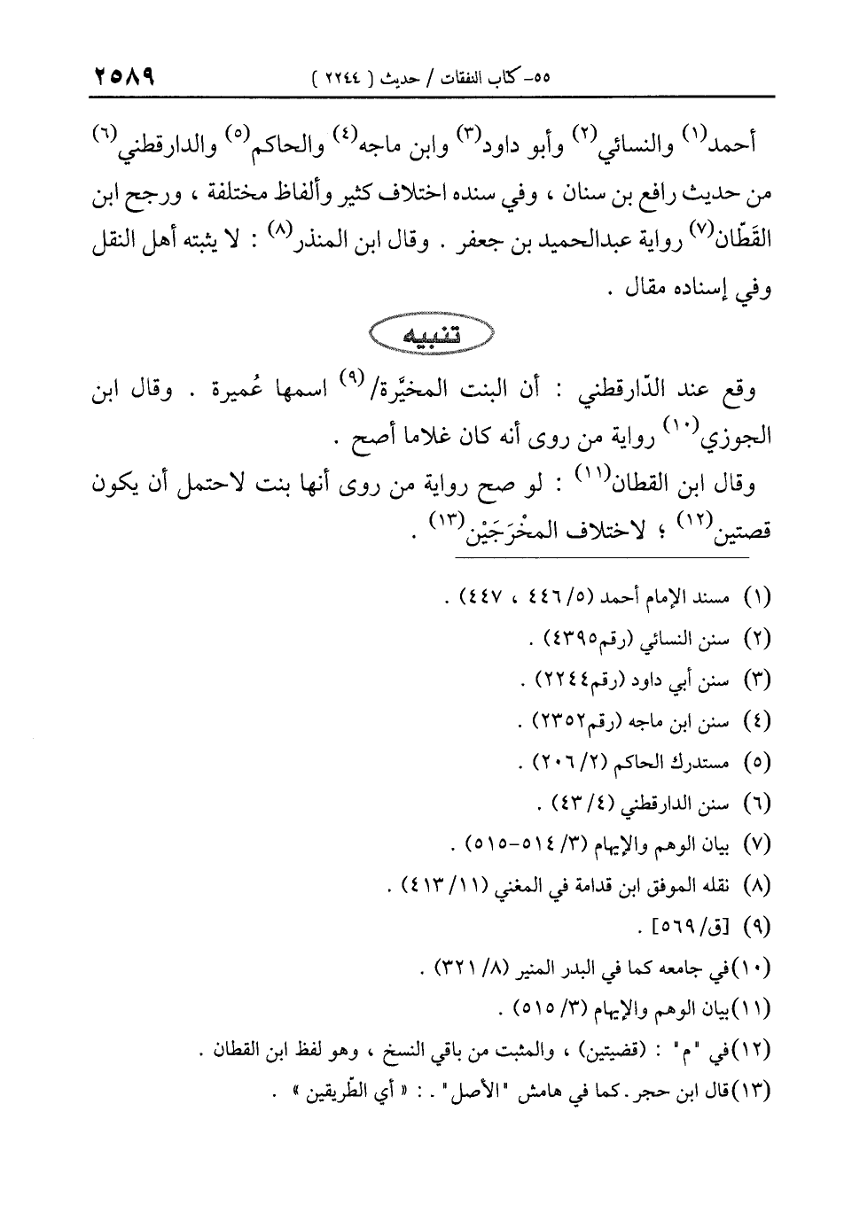 وقع عند الدّارقطني: أن البنت المخيَّرة (¬9) اسمها عُميرة. وقال ابن الجوزي (¬10) رواية من روى أنه كان غلاما أصح.