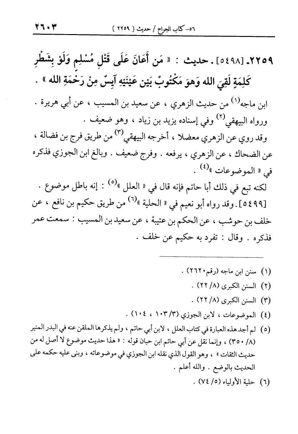 2259 - [5498]- حديث: "مَن أَعَانَ عَلَى قَتْلِ مُسْلِمٍ وَلَوْ بِشَطْرِ كَلِمَةٍ لَقِيَ الله وَهوَ مَكْتُوبٌ بَين عَينَيهِ آيِسٌ مِنْ رَحْمَةِ الله".