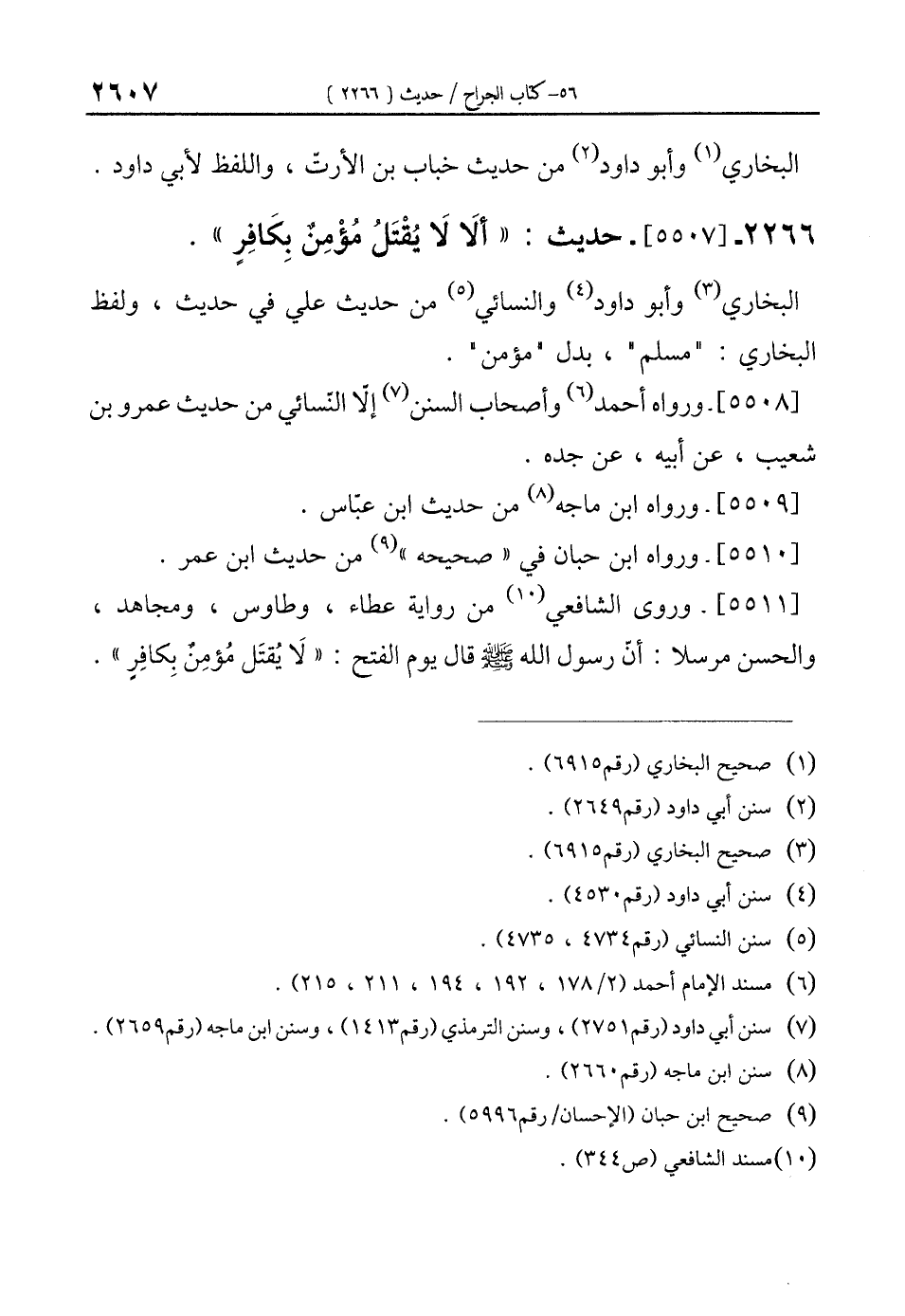2266 - [5507]- حديث: "ألاَ لاَ يُقْتَلُ مُؤْمِنٌ بِكَافِرٍ".