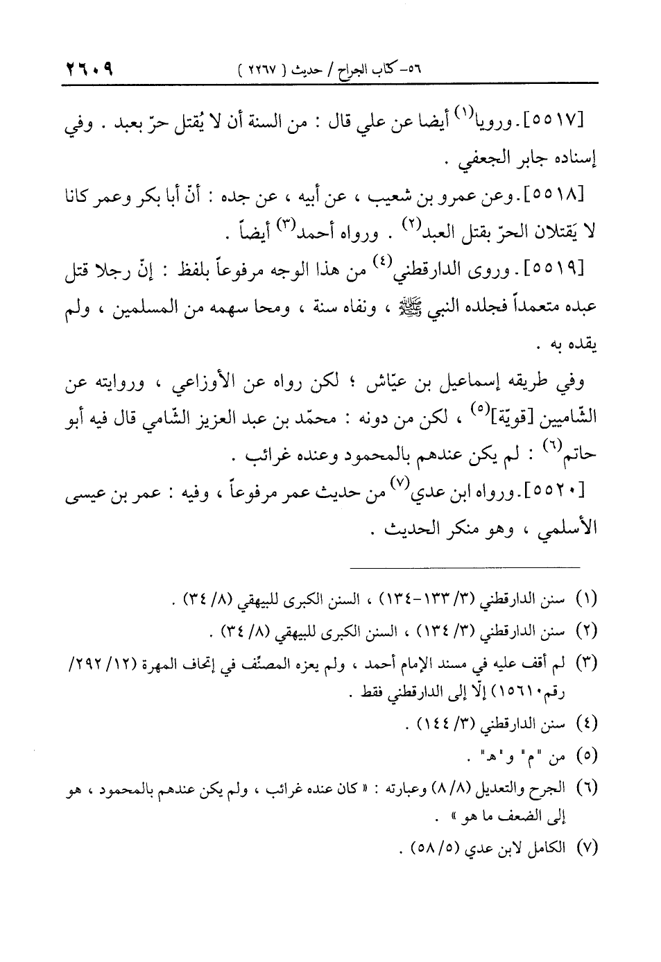 [5517]- ورويا (¬1) أيضا عن علي قال: من السنة أن لا يُقتل حرّ بعبد. وفي إسناده جابر الجعفي.