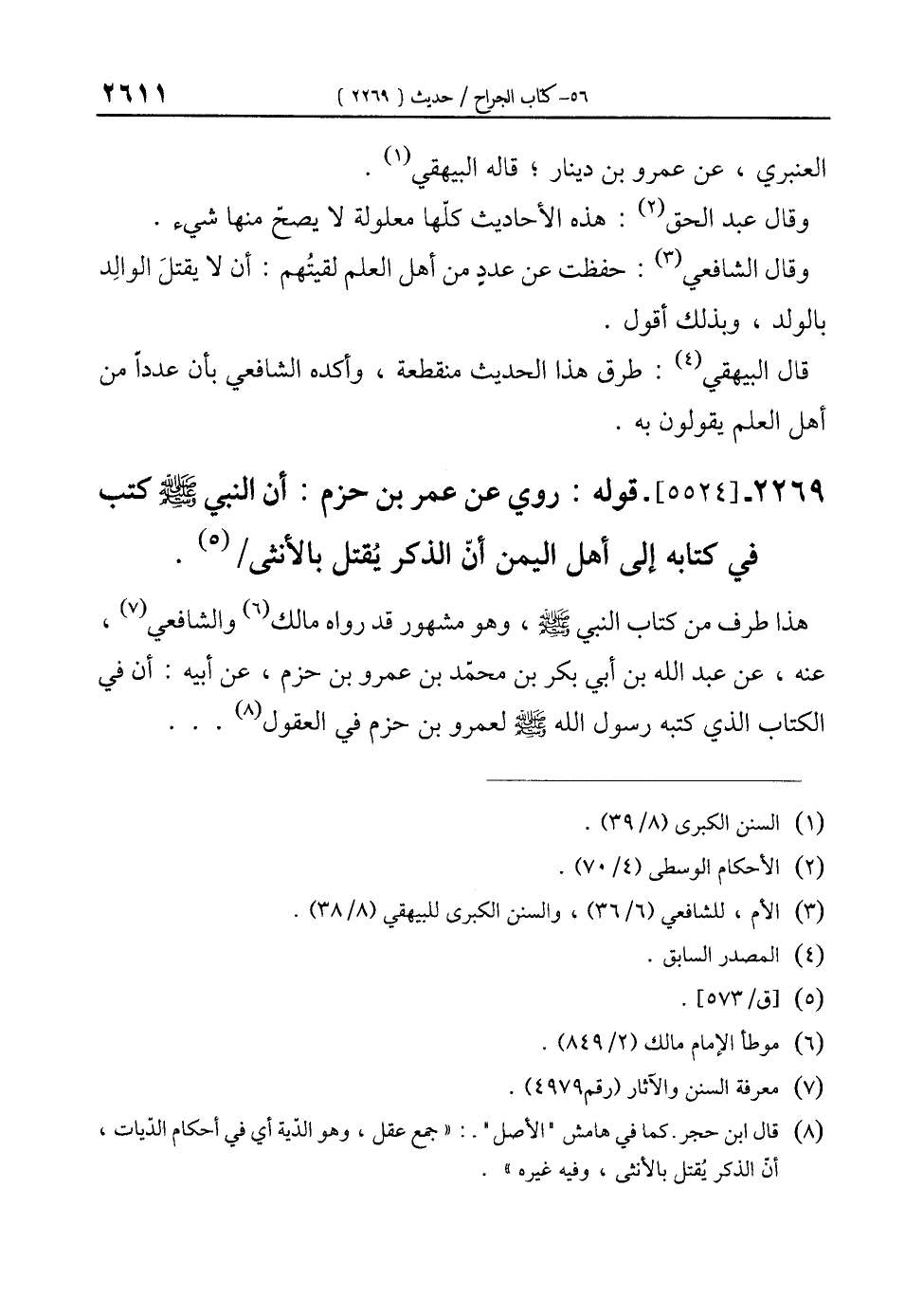 2269 - [5524]- قوله: روي عن عمر بن حزم: أن النبي - صلى الله عليه وسلم - كتب في كتابه إلى أهل اليمن أنّ الذكر يُقتل بالأنثى (¬5).