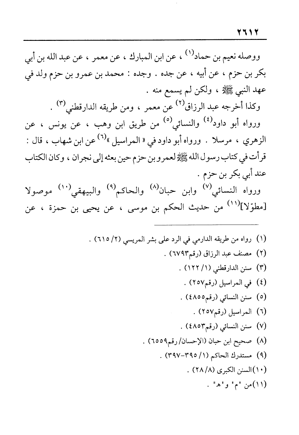 ورواه أبو داود (¬4) والنسائي (¬5) من طريق ابن وهب، عن يونس، عن الزهري، مرسلًا. ورواه أبو داود في "المراسيل" (¬6) عن ابن شهاب، قال: قرأت في كتاب رسول الله - صلى الله عليه وسلم - لعمرو بن حزم حين بعثه إلى نجران، وكان الكتاب عند أبي بكر بن حزم.