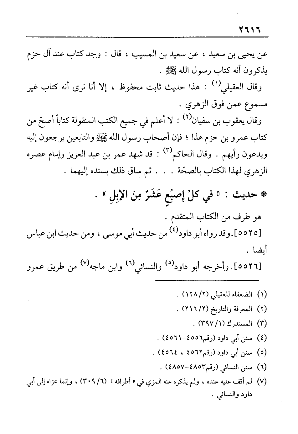 وقال يعقوب بن سفيان (¬2): لا أعلم في جميع الكتب المنقولة كتابًا أصحّ من كتاب عمرو بن حزم هذا؛ فإن أصحاب رسول الله - صلى الله عليه وسلم - والتابعين يرجعون إليه ويدعون رأيهم. وقال الحاكم (¬3): قد شهد عمر بن عبد العزيز وإمام عصره الزهري لهذا الكتاب بالصحّة ... ثم ساق ذلك بسنده إليهما.