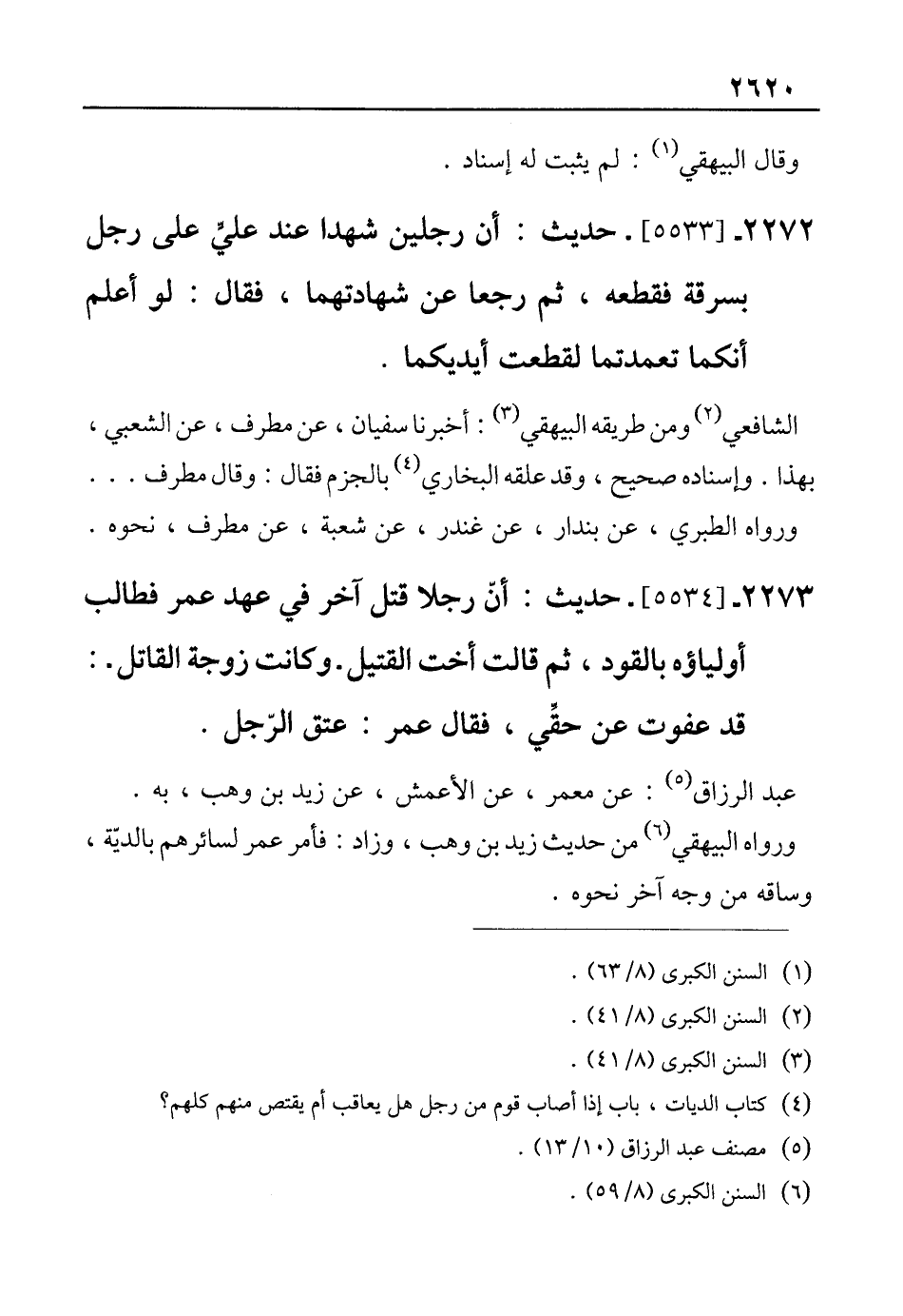2272 - [5533]- حديث: أن رجلين شهدا عند عليٍّ على رجل بسرقة فقطعه، ثم رجعا عن شهادتهما، فقال: لو أعلم أنكما تعمدتما لقطعت أيديكما.