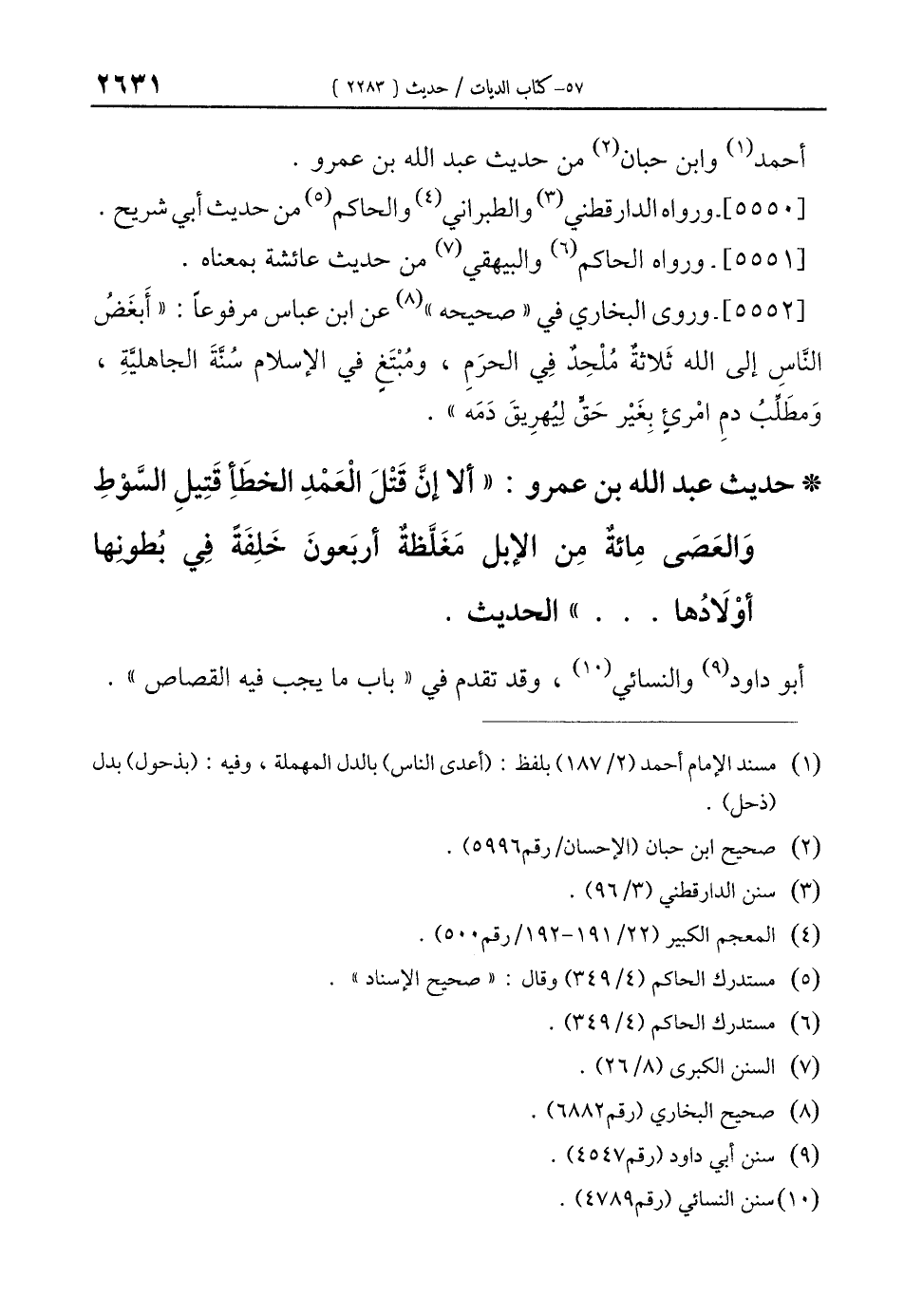 * حديث عبد الله بن عمرو: "ألا إنَّ قَتْلَ الْعَمْدِ الخطَأِ قَتِيلِ السَّوْطِ وَالعَصَى مِائةٌ مِن الإبل مَغَلَّظةٌ أربَعونَ خَلِفَةً في بُطونِها أوْلاَدُها ... " الحديث.