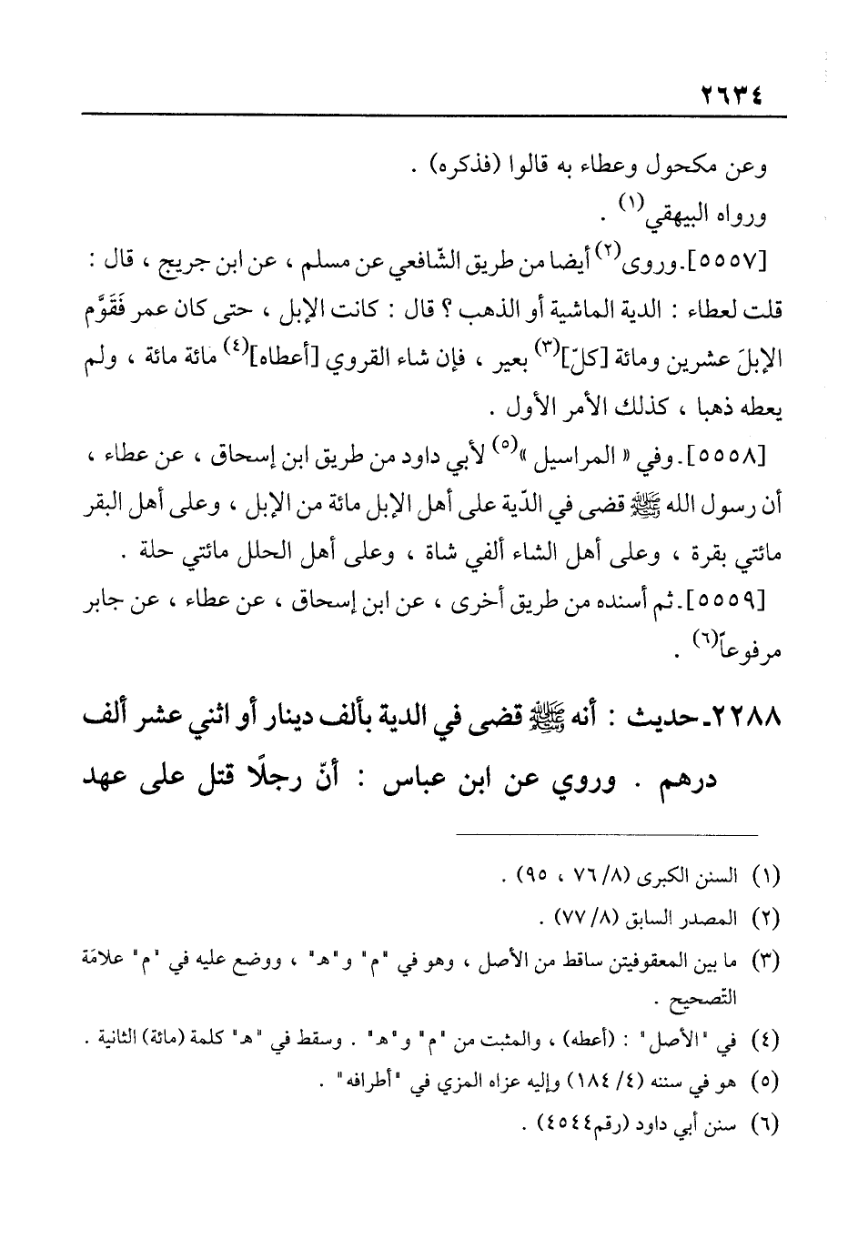 [5558]- وفي "المراسيل" (¬5) لأبي داود من طريق ابن إسحاق، عن عطاء، أن رسول الله - صلى الله عليه وسلم - قضى في الدّية على أهل الإبل مائة من الإبل، وعلى أهل البقر مائتي بقرة، وعلى أهل النساء ألفي شاة، وعلى أهل الحلل مائتي حلة.