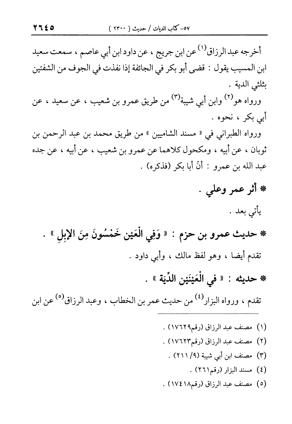 * حديث عمرو بن حزم: "وَفِي الْعَين خَمْسُونَ مِنَ الإبِلِ".
