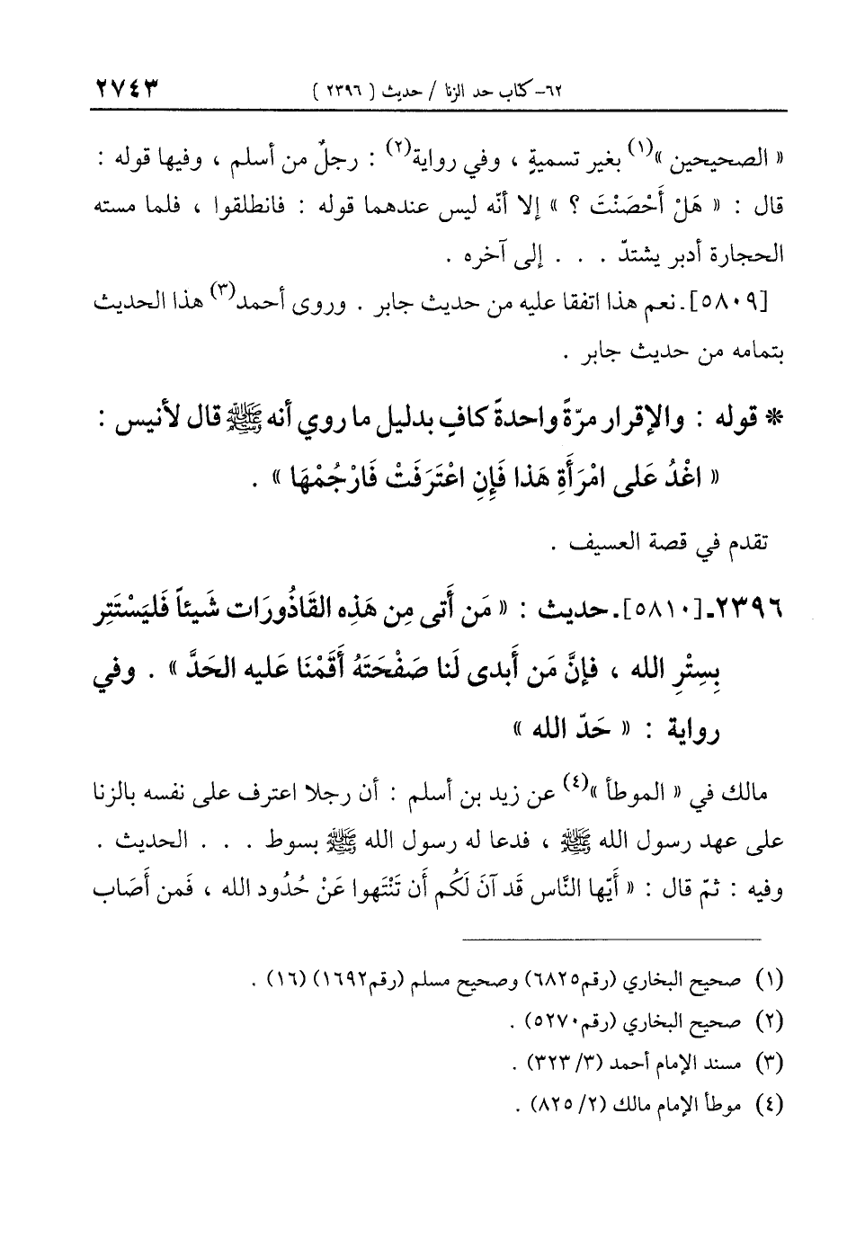 2396 - [5810]- حديث: "مَن أَتى مِن هَذِه القَاذُورَات شَيئًا فَليَسْتَتِر بِسِتْرِ الله، فإنَّ مَن أَبدى لَنا صَفْحَتَهُ أَقَمْنَا عَليه الحَدَّ". وفي رواية: "حَدّ الله".