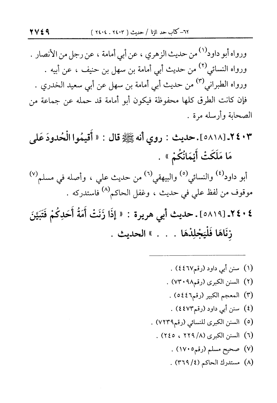 2403 - [5818]- حديث: روي أنّه - صلى الله عليه وسلم - قال: "أَقيمُوا الْحُدودَ عَلى مَا مَلَكَتْ أَيْمَانُكُمْ".