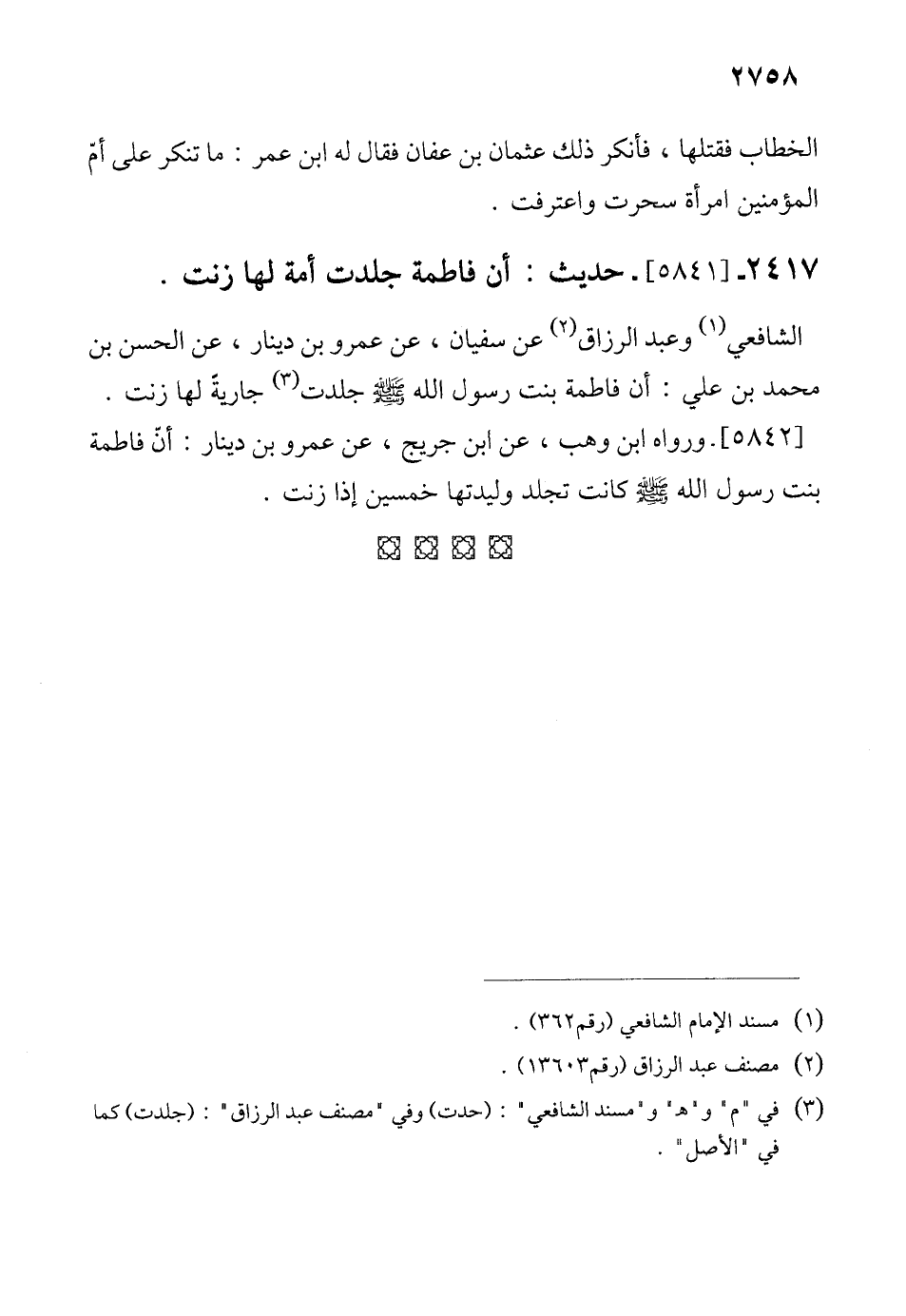 2417 - [5841]- حديث: أن فاطمة جلدت أمة لها زنت.