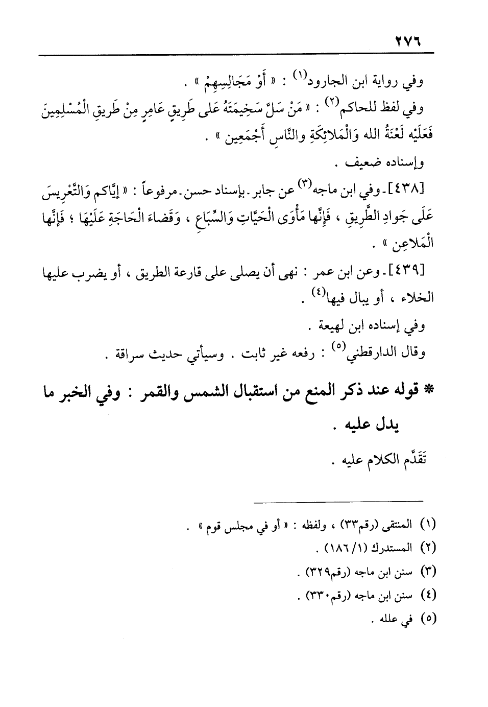 [438]- وفي ابن ماجه (¬3) عن جابر بإسناد حسن- مرفوعًا: "إيّاكم وَالتَّعْرِيسَ عَلَى جَوادِ الطَّرِيقِ، فَإِنها مَأْوَى الْحَيَّاتِ وَالسِّبَاعِ، وَقَضاءَ الْحَاجَةِ عَلَيْهَا؛ فَإنَّها الْمَلاعِن".
