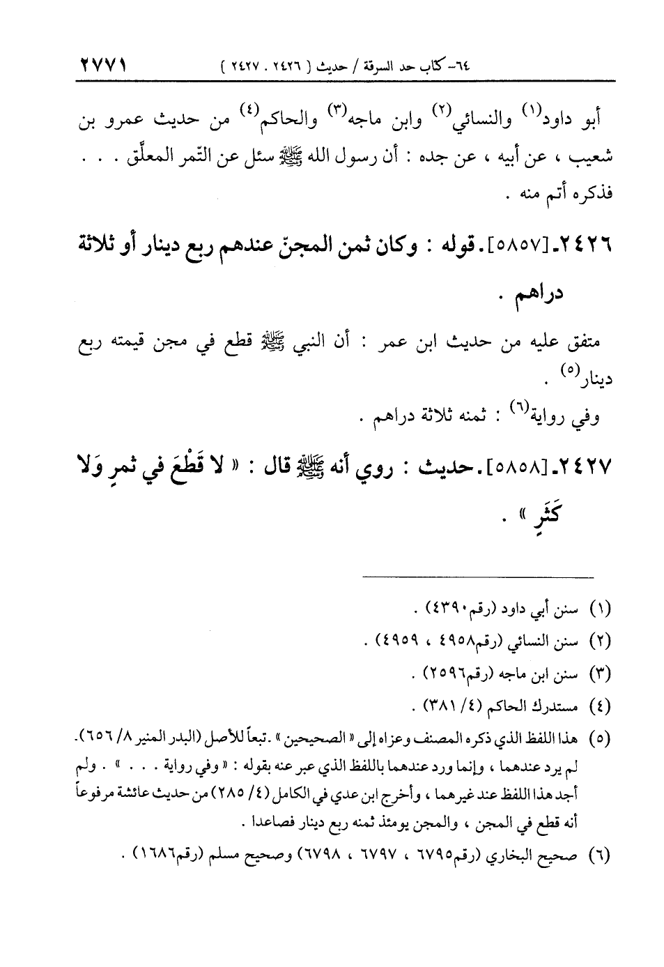 2427 - [5858]- حديث: روي أنه - صلى الله عليه وسلم - قال: "لا قَطْعَ في ثمرٍ وَلا كثَرٍ".