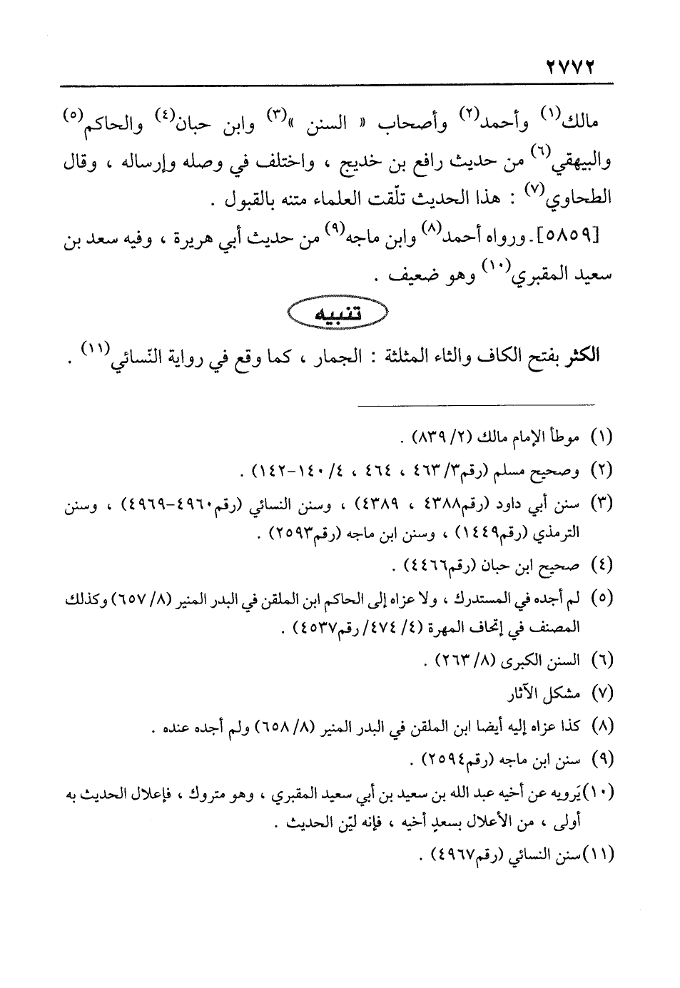 مالك (¬1) وأحمد (¬2) وأصحاب "السنن" (¬3) وابن حبان (¬4) والحاكم (¬5) والبيهقي (¬6) من حديث رافع بن خديج، واختلف في وصله وإرساله، وقال الطحاوي (¬7): هذا الحديث تلّقت العلماء متنه بالقبول.