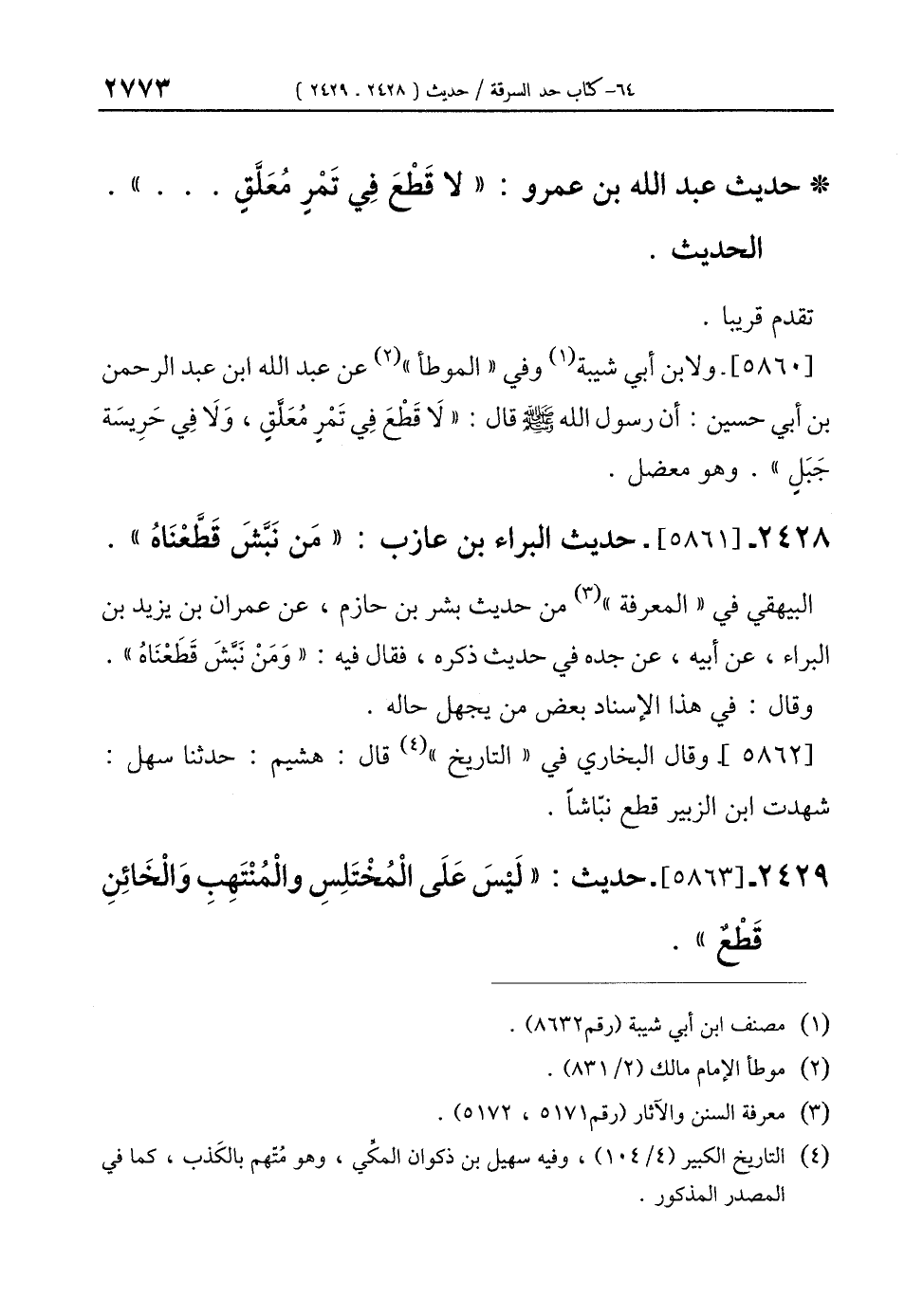 2429 - [5863]- حديث: "لَيسَ عَلَى الْمُخْتَلِسِ والْمُنْتَهِبِ وَالْخَائِنِ قَطْعٌ".
