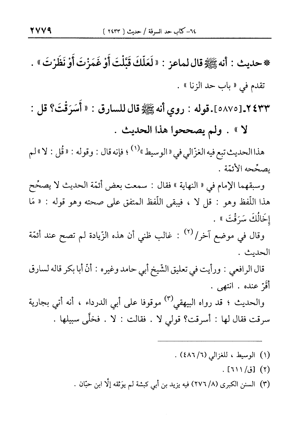 2433 - [5875]- قوله: روي أنه - صلى الله عليه وسلم - قال للسارق: "أَسَرَقْتَ؟ قل: لا". ولم يصححوا هذا الحديث.