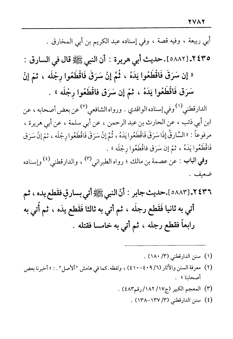 2436 - [5883]- حديث جابر: أنّ النبي - صلى الله عليه وسلم - أتي بسارقٍ فقَطع يده، ثم أتي به ثانيا فَقَطع رجلَه، ثم أتي به ثالثا فَقَطع يدَه، ثم أُتي به رابعًا فقطع رجله، ثم أتي به خامسا فقتله.