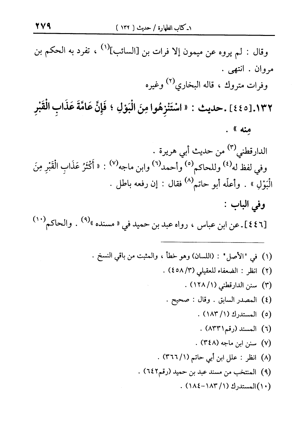 132 - [445]- حديث: "اسْتَنْزِهُوا مِنَ الْبَوْلِ؛ فإِنَّ عَافَة عَذَابِ الْقَبْرِ مِنه".