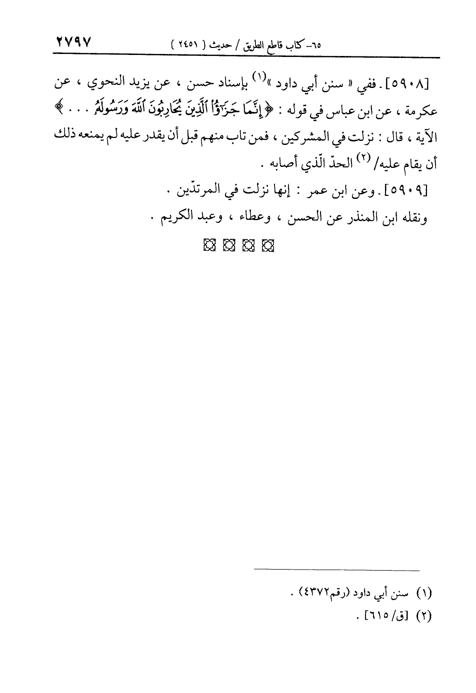 [5908]- ففي "سنن أبي داود" (¬1) بإسناد حسن، عن يزيد النحوي، عن عكرمة، عن ابن عباس في قوله: {إِنَّمَا جَزَاءُ الَّذِينَ يُحَارِبُونَ اللَّهَ وَرَسُولَهُ ...} الآية، قال: نزلت في المشركين، فمن تاب منهم قبل أن يقدر عليه لم يمنعه ذلك أن يقام عليه (¬2) الحدّ الّذي أصابه.