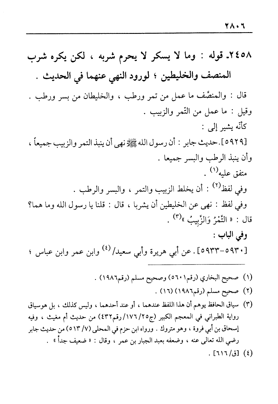 2458 - قوله: وما لا يسكر لا يحرم شربه، لكن يكره شرب المنصف والخليطين، لورود النهي عنهما في الحديث.