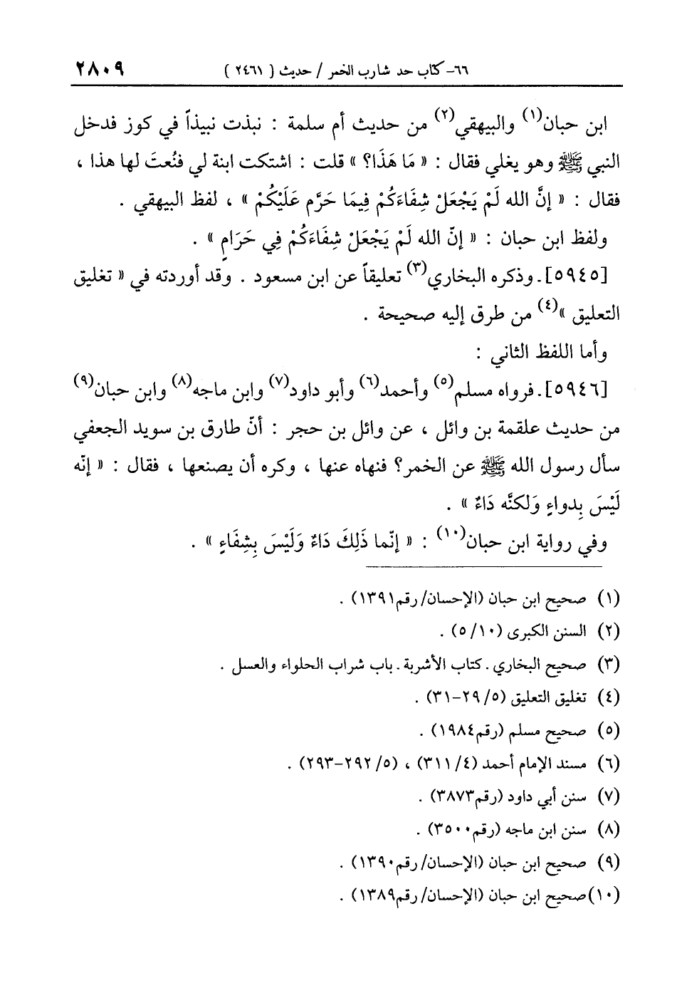 [5946]- فرواه مسلم (¬5) وأحمد (¬6) وأبو داود (¬7) وابن ماجه (¬8) وابن حبان (¬9) من حديث علقمة بن وائل، عن وائل بن حجر: أن طارق بن سويد الجعفي سأل رسول الله - صلى الله عليه وسلم - عن الخمر؟ فنهاه عنها، وكره أن يصنعها، فقال: "إنّه لَيْسَ بِدواءٍ وَلكنَّه دَاءٌ".