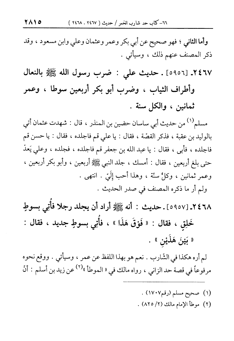2467 - [5956]- حديث علي: ضرب رسول الله - صلى الله عليه وسلم - بالنعال وأطراف الثياب، وضرب أبو بكر أربعين سوطا، وعمر ثمانين، والكل سنة.
