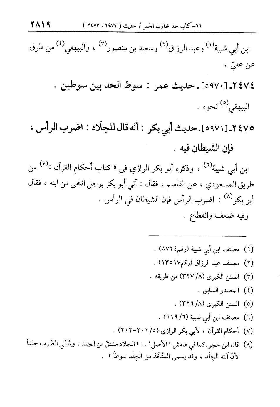 2475 - [5971]- حديث أبي بكر: أنّه قال للجلّاد: اضرب الرأس، فإن الشيطان فيه.
