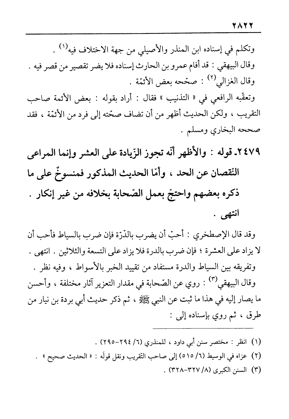 2479 - قوله: والأظهر أنّه تجوز الزّيادة على العشر وإنما المراعى النّقصان عن الحد، وأمّا الحديث المذكور فمنسوخٌ على ما ذكره بعضهم واحتجّ بعمل الصّحابة بخلافه من غير إنكار.