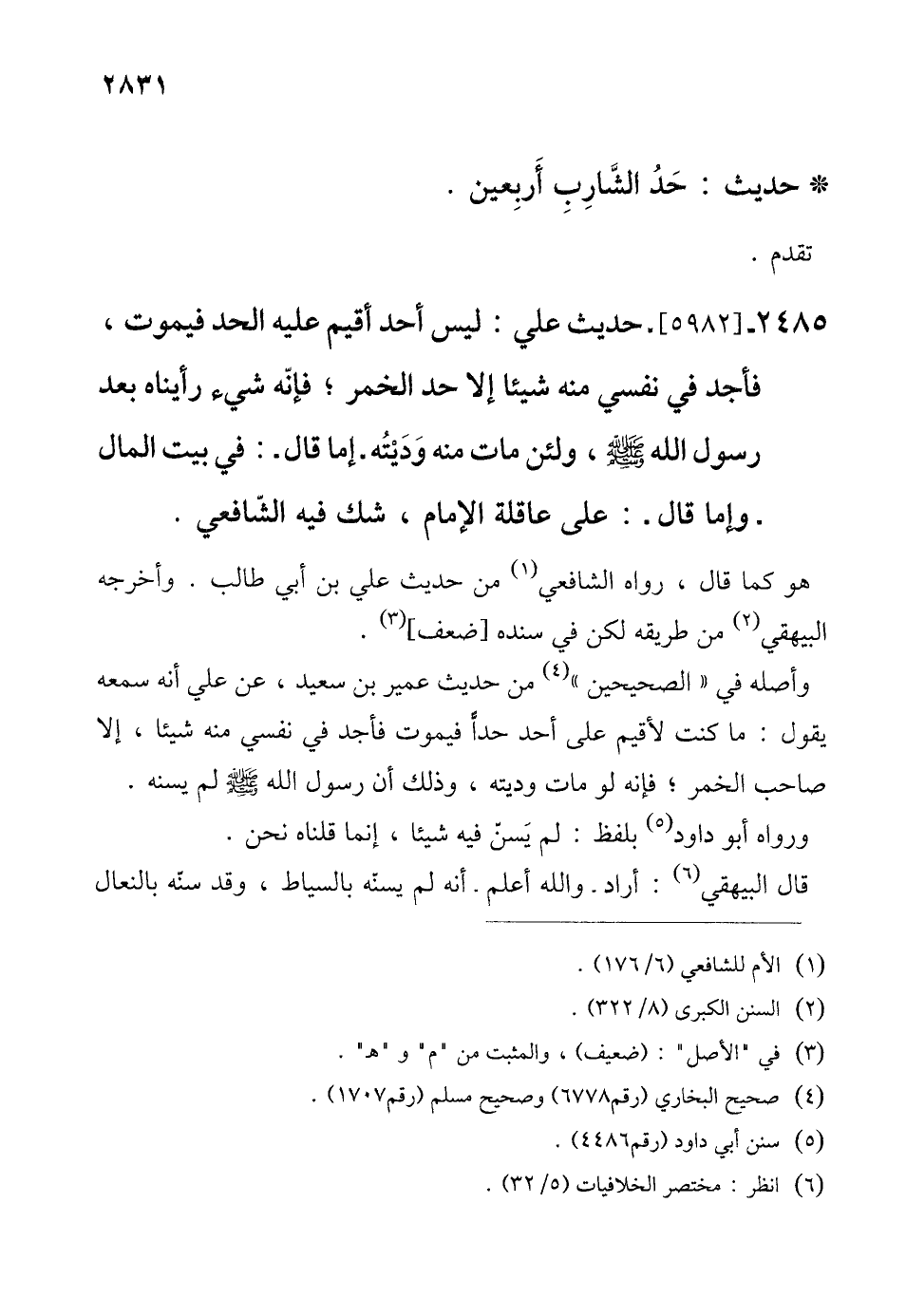 2485 - [5982]- حديث علي: ليس أحد أقيم عليه الحد فيموت، فأجد في نفسي منه شيئا إلا حد الخمر؛ فإنّه شيء رأيناه بعد رسول الله - صلى الله عليه وسلم -، ولئن مات منه وَدَيْتُه -إما قال-: في بيت المال -وإما قال-: على عاقلة الإِمام، شك فيه الشّافعي.