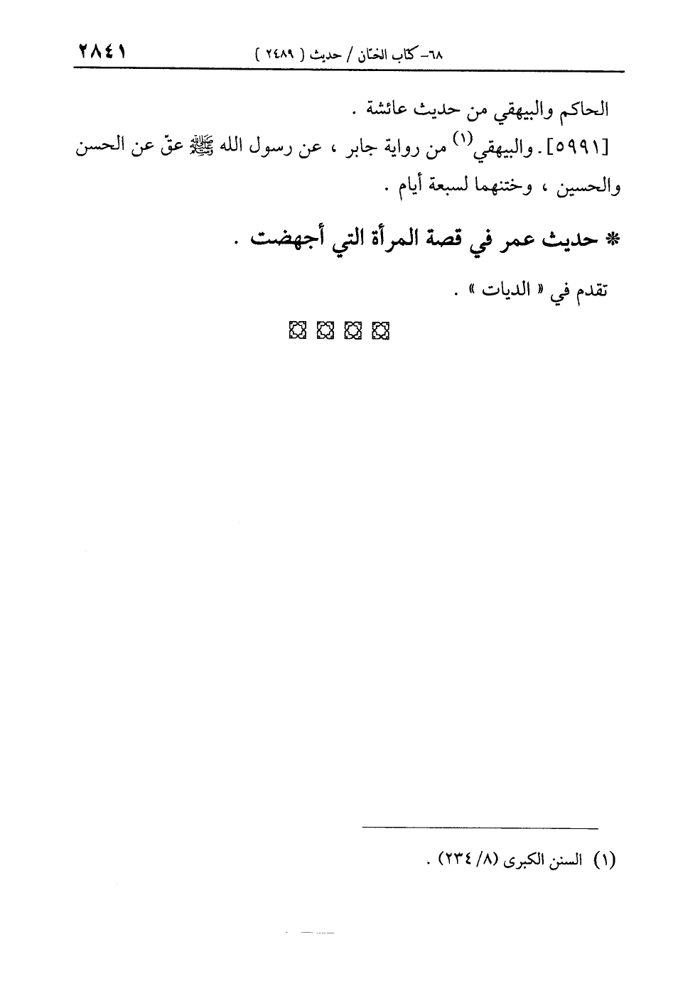 [5991]- والبيهقي (¬1) من رواية جابر، عن رسول الله - صلى الله عليه وسلم - عقّ عن الحسن والحسين، وختنهما لسبعة أيام.