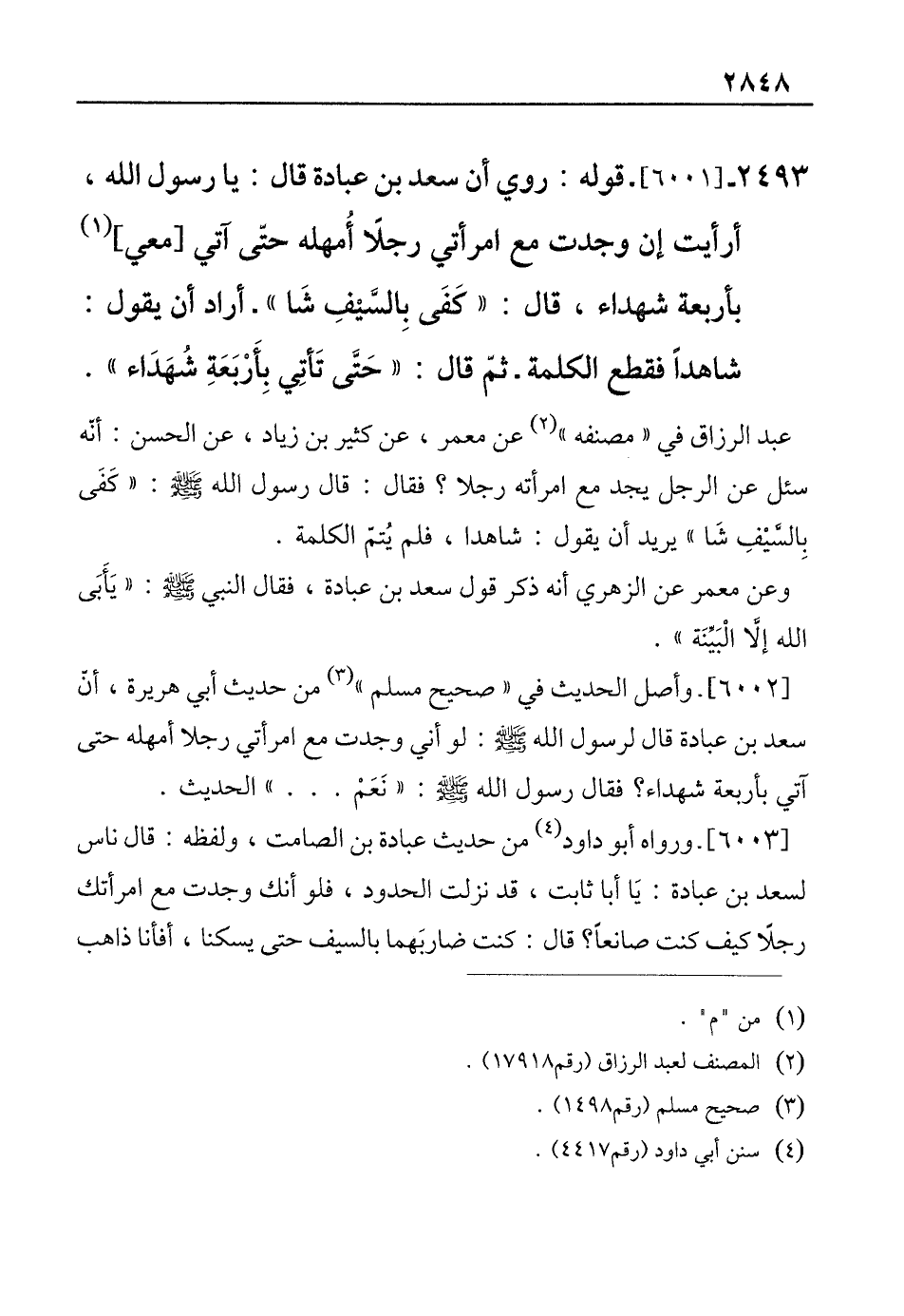 2493 - [6001]- قوله: روي أن سعد بن عبادة قال: يا رسول الله، أرأيت إن وجدت مع امرأتي رجلًا أُمهله حتّى آتي [معي] (¬1) بأربعة شهداء، قال: "كَفَى بِالسَّيْفِ شَا". أراد أن يقول: شاهدًا فقطع الكلمة. ثمّ قال: "حَتَّى تَأتِي بِأَرْبَعَةِ شُهدَاء".