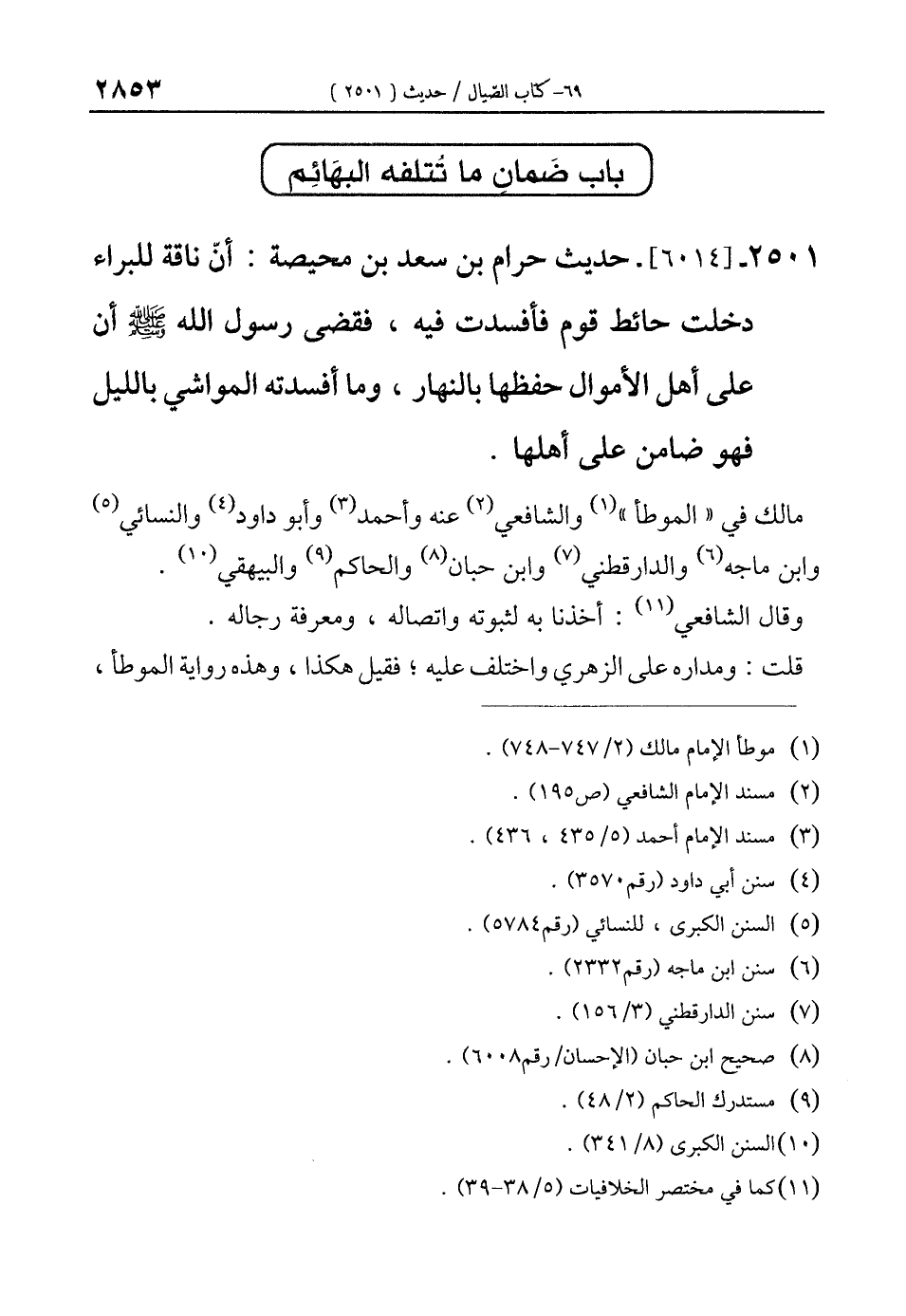 2501 - [6014]- حديث حرام بن سعد بن محيصة: أنّ ناقة للبراء دخلت حائط قوم فأفسدت فيه، فقضى رسول الله - صلى الله عليه وسلم - أن على أهل الأموال حفظها بالنهار، وما أفسدته المواشي بالليل فهو ضامن على أهلها.