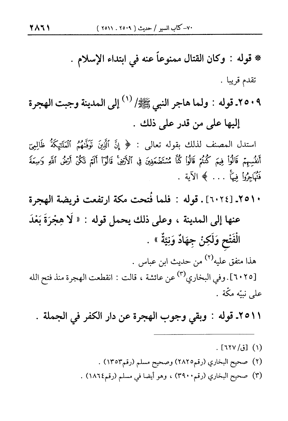2509 - قوله: ولما هاجر النبي - صلى الله عليه وسلم - (¬1) إلى المدينة وجبت الهجرة إليها على من قدر على ذلك.