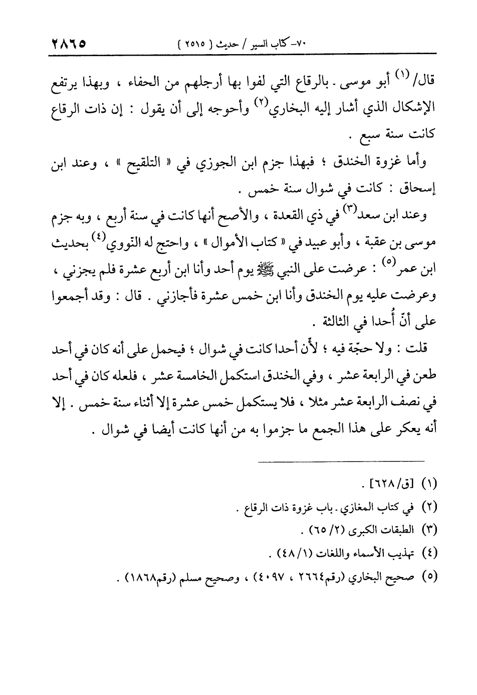 قلت: ولا حجّة فيه؛ لأن أحدا كانت في شوال؛ فيحمل على أنَّه كان في أحد طعن في الرابعة عشر، وفي الخندق استكمل الخامسة عشر، فلعله كان في أحد في نصف الرابعة عشر مثلا، فلا يستكمل خمس عشرة إلا أثناء سنة خمس، إلا أنَّه يعكر على هذا الجمع ما جزموا به من أنها كانت أيضا في شوال.