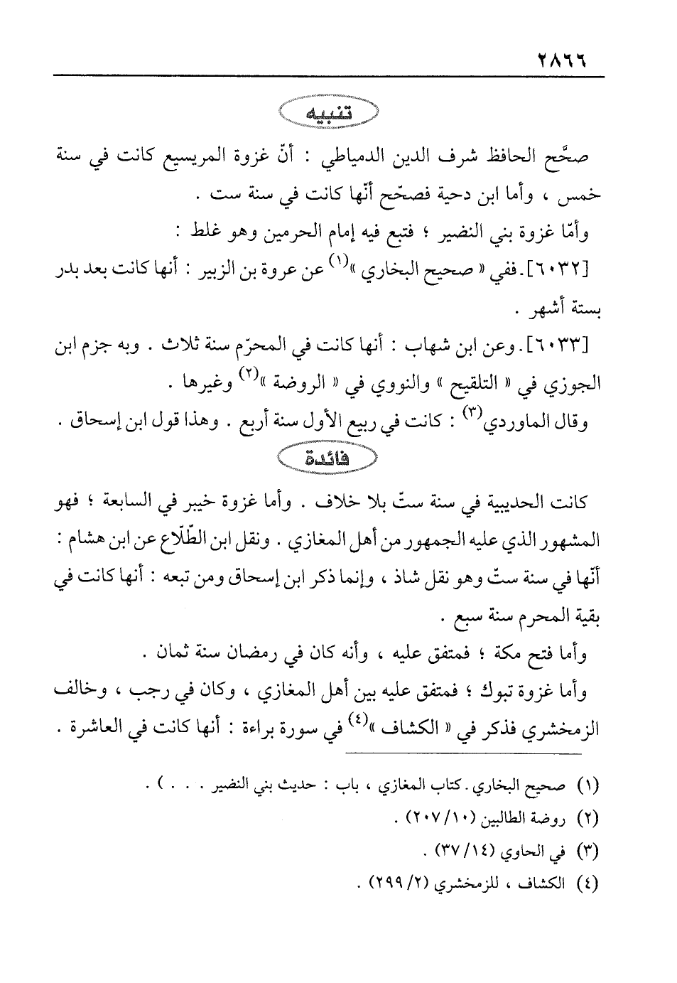 كانت الحديبية في سنة ستّ بلا خلاف. وأما غزوة خيبر في السابعة؛ فهو المشهور الذي عليه الجمهور من أهل المغازي. ونقل ابن الطّلّاع عن ابن هشام: أنها في سنة ستّ وهو نقل شاذ، وإنما ذكر ابن إسحاق ومن تبعه: أنها كانت في بقية المحرم سنة سبع.