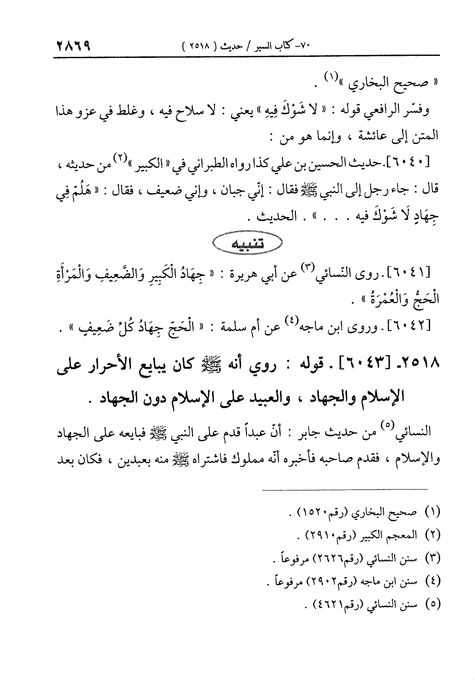 [6041]- روى النّسائي (¬3) عن أبي هريرة: "جِهَادُ الْكَبِيرِ وَالضَّعِيفِ وَالْمَرْأَةِ الْحَجّ وَالْعُمْرَةُ".