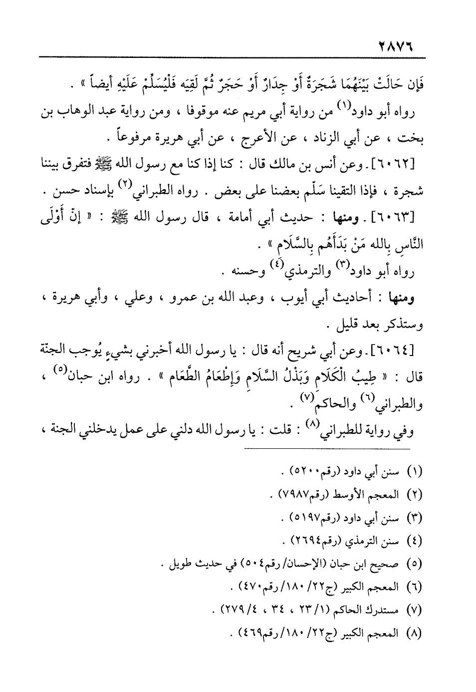 [6062]- وعن أنس بن مالك قال: كنا إذا كنا مع رسول الله - صلى الله عليه وسلم - فتفرق بيننا شجرة، فإذا التقينا سَلّم بعضنا على بعض. رواه الطبراني (¬2) بإسناد حسن.