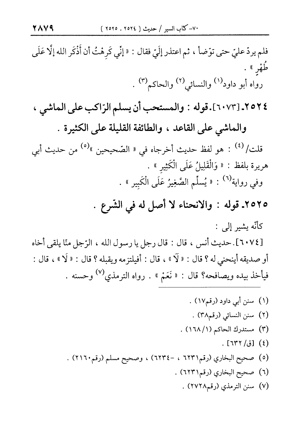 2524 - [6073]- قوله: والمستحب أنَّ يسلم الرّاكب على الماشي، والماشي على القاعد، والطائفة القليلة على الكثيرة.