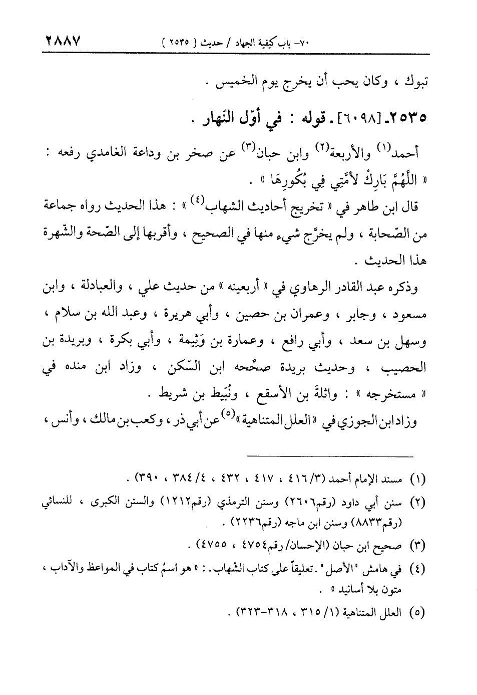 أحمد (¬1) والأربعة (¬2) وابن حبان (¬3) عن صخر بن وداعة الغامدي رفعه: "اللهُمَّ بَارِكْ لأمَّتِي في بُكُورِهَا".