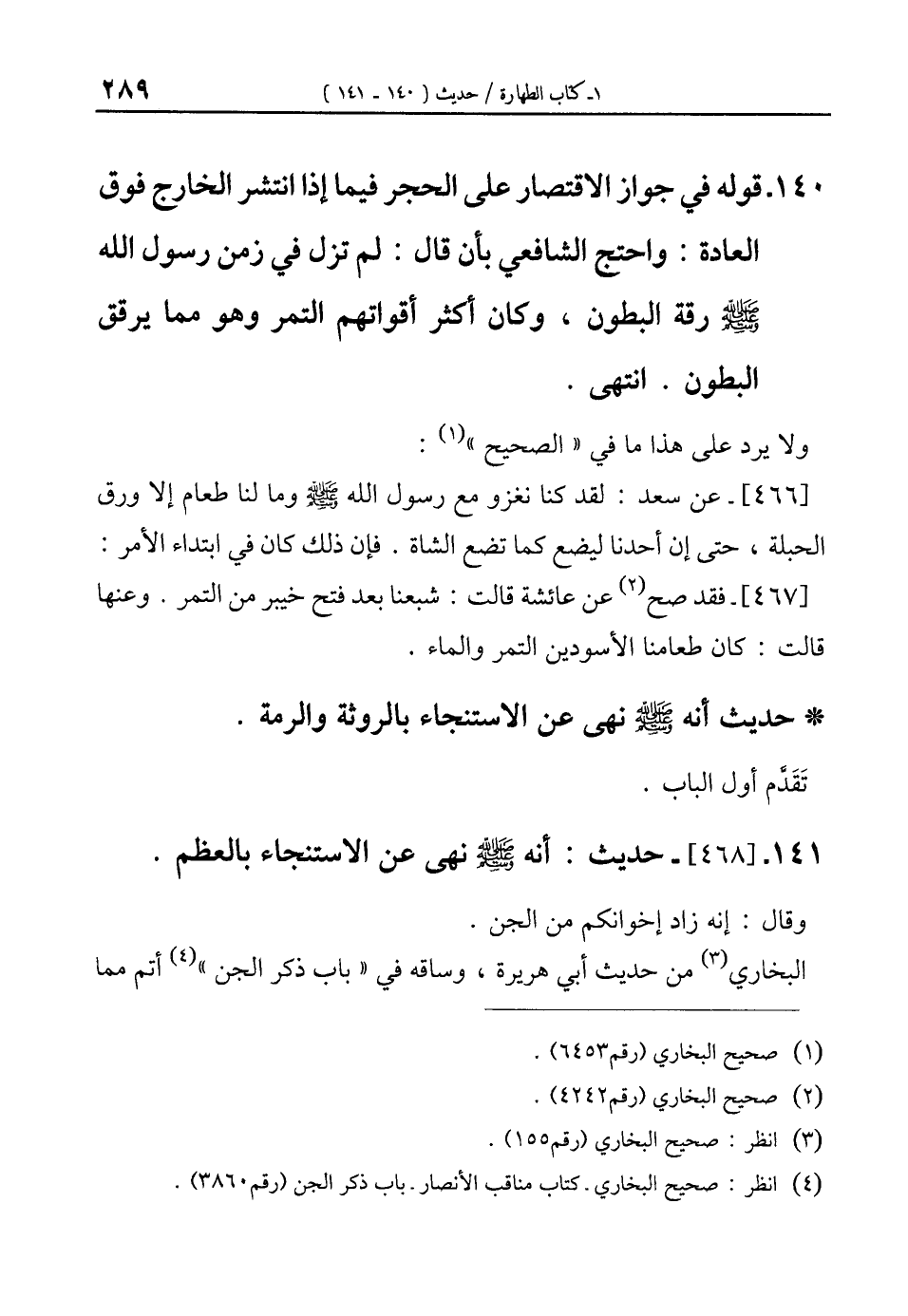141 - [468]- حديث: أنه - صلى الله عليه وسلم - نهى عن الاستنجاء بالعظم.