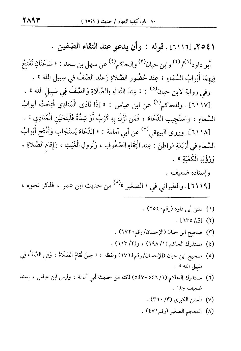 (¬5) صحيح ابن حبان (الإحسان/ رقم 1764) ولفظه: "حِينَ تُقامُ الصَّلَاةُ، وَفِي الصَّفِّ في سَبِيل الله".