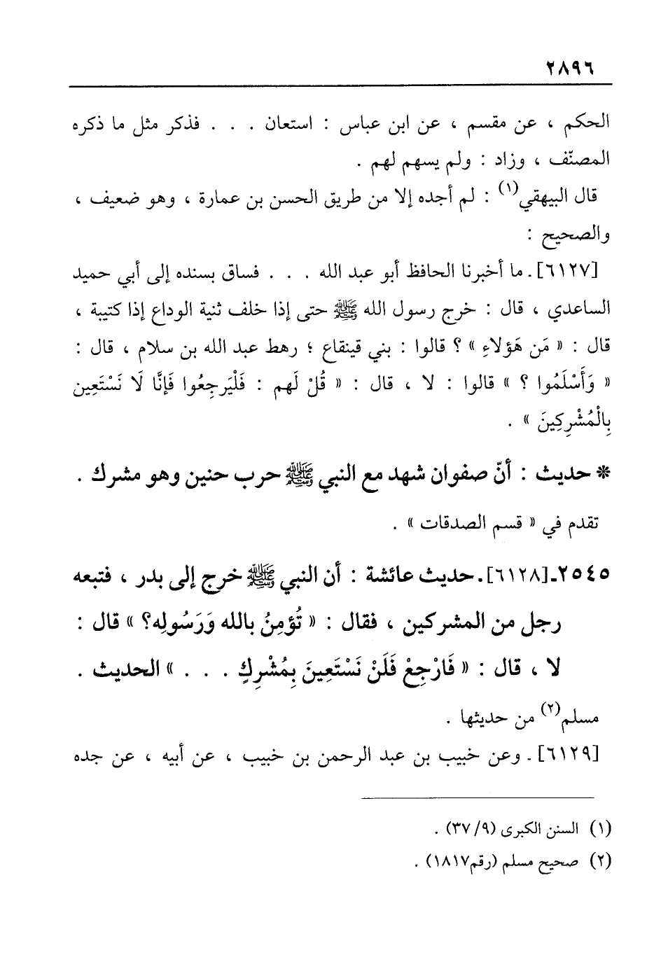 2545 - [6128]- حديث عائشة: أنَّ النبي - صلى الله عليه وسلم - خرج إلى بدر، فتبعه رجل من المشركين، فقال: "تُؤمِنُ بالله وَرَسُولِه؟ " قال: لا، قال: "فَارْجِعْ فَلَنْ نَسْتَعِينَ بِمُشْرِكٍ ... " الحديث. مسلم (¬2) من حديثها.