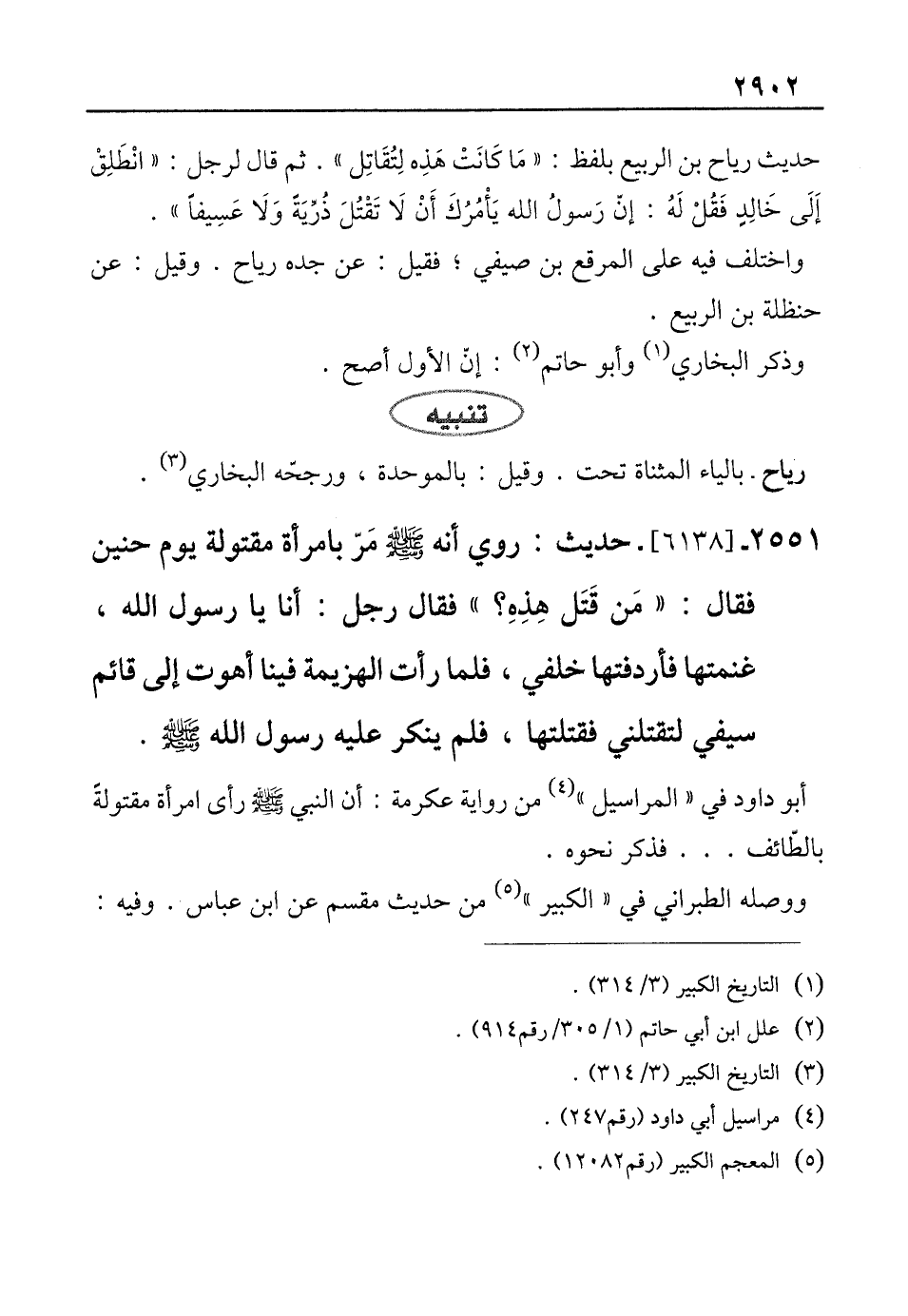 حديث رياح بن الربيع بلفظ: "مَا كَانَتْ هَذِه لِتُقَاتِل". ثم قال لرجل: "انْطَلِقْ إَلَى خَالِدٍ فَقُلْ لَهُ: إنّ رَسولُ الله يَأْمُرُكَ أَنْ لَا تَقْتُلَ ذُرِّيَةً وَلَا عَسِيفًا".