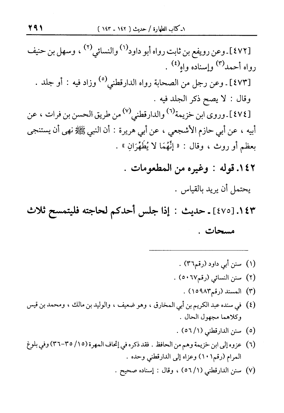 143 - [475]- حديث: إذا جلس أحدكم لحاجته فليتمسح ثلاث مسحات.
