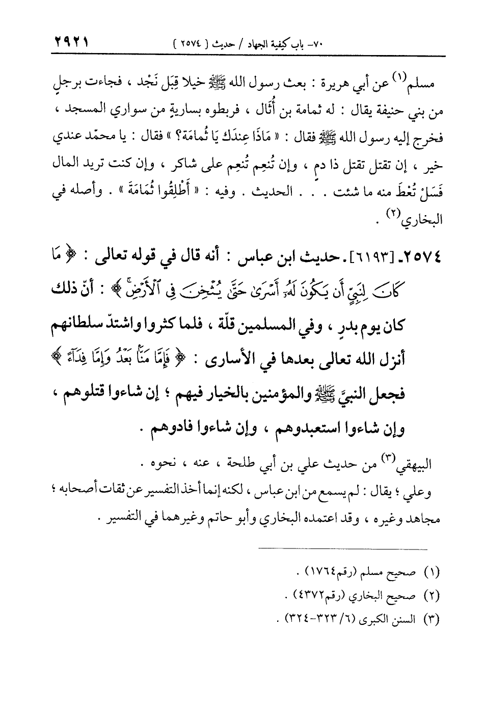 2574 - [6193]- حديث ابن عباس: أنَّه قال في قوله تعالى: {مَا كَانَ لِنَبِيٍّ أَنْ يَكُونَ لَهُ أَسْرَى حَتَّى يُثْخِنَ فِي الْأَرْضِ}: أنّ ذلك كان يوم بدرٍ، وفي المسلمين قلّة، فلما كثروا واشتدّ سلطانهم أنزل الله تعالى بعدها في الأسارى: {فَإِمَّا مَنًّا بَعْدُ وَإِمَّا فِدَاءً} فجعل النبيَّ - صلى الله عليه وسلم - والمؤمنين بالخيار فيهم؛ إن شاءوا قتلوهم، وإن شاءوا استعبدوهم، وإن شاءوا فادوهم.