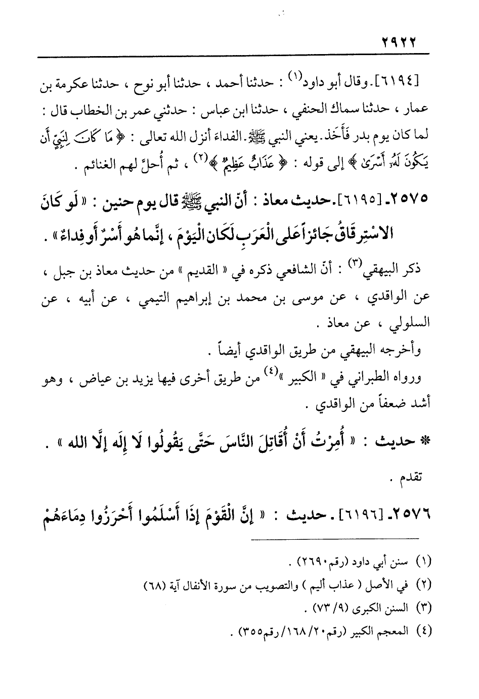 2575 - [6195]- حديث معاذ: أنّ النبي - صلى الله عليه وسلم - قال يوم حنين: "لَو كَانَ الاسْتِرقَاقُ جَائزًا عَلى الْعَرَبِ لَكَان الْيَوْمَ، إنَّما هُو أَسْرٌ أَو فِداءٌ".