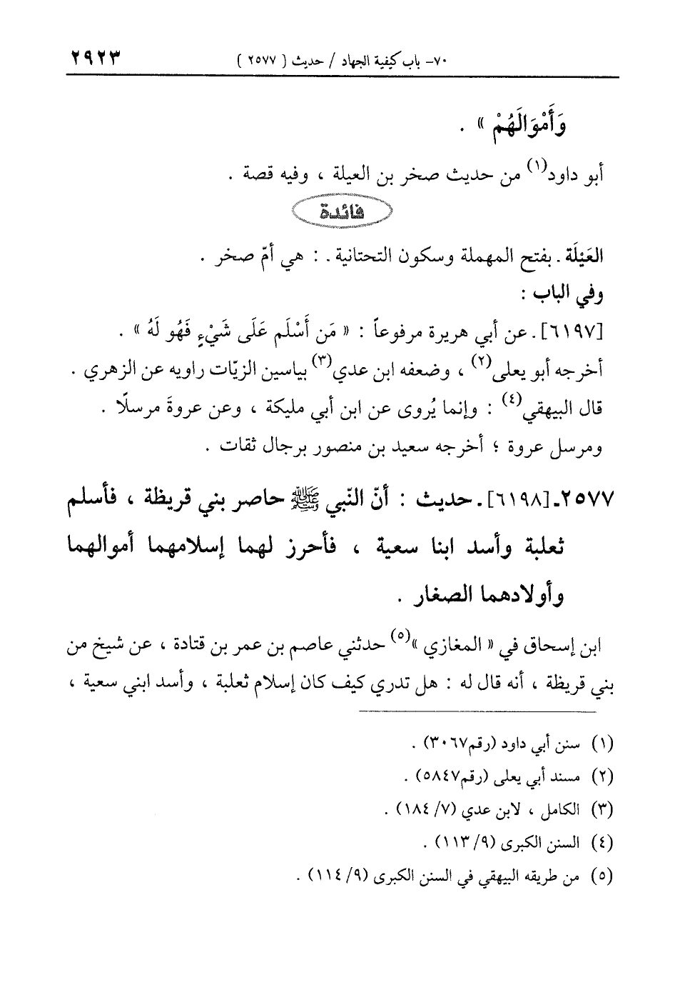 2577 - [6198]- حديث: أنّ النّبي - صلى الله عليه وسلم - حاصر بني قريظة، فأسلم ثعلبة وأسد ابنا سعية، فأحرز لهما إسلامهما أموالهما وأولادهما الصغار.