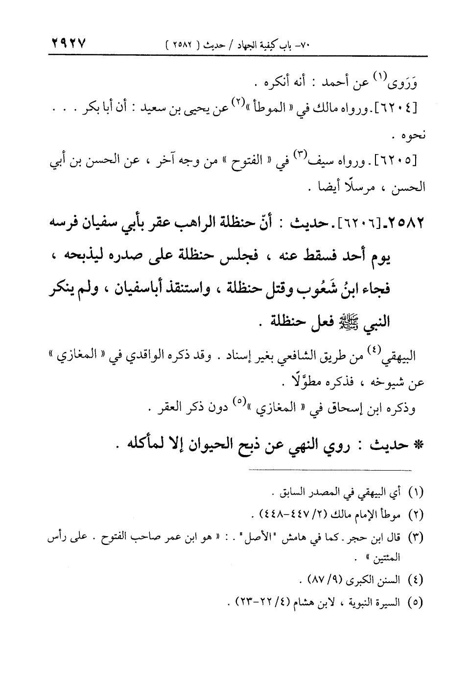 2582 - [6206]- حديث: أنّ حنظلة الراهب عقر بأبي سفيان فرسه يوم أحد فسقط عنه، فجلس حنظلة على صدره ليذبحه، فجاء ابنُ شَعُوب وقتل حنظلة، واستنقذ أبا سفيان، ولم ينكر النبي - صلى الله عليه وسلم - فعل حنظلة.