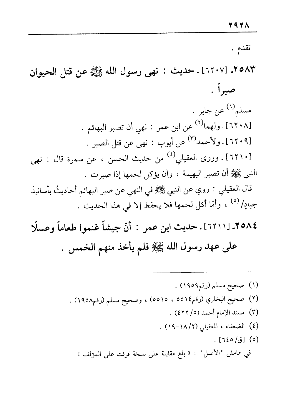 2583 - [6207]- حديث: نهى رسول الله - صلى الله عليه وسلم - عن قتل الحيوان صبرًا.