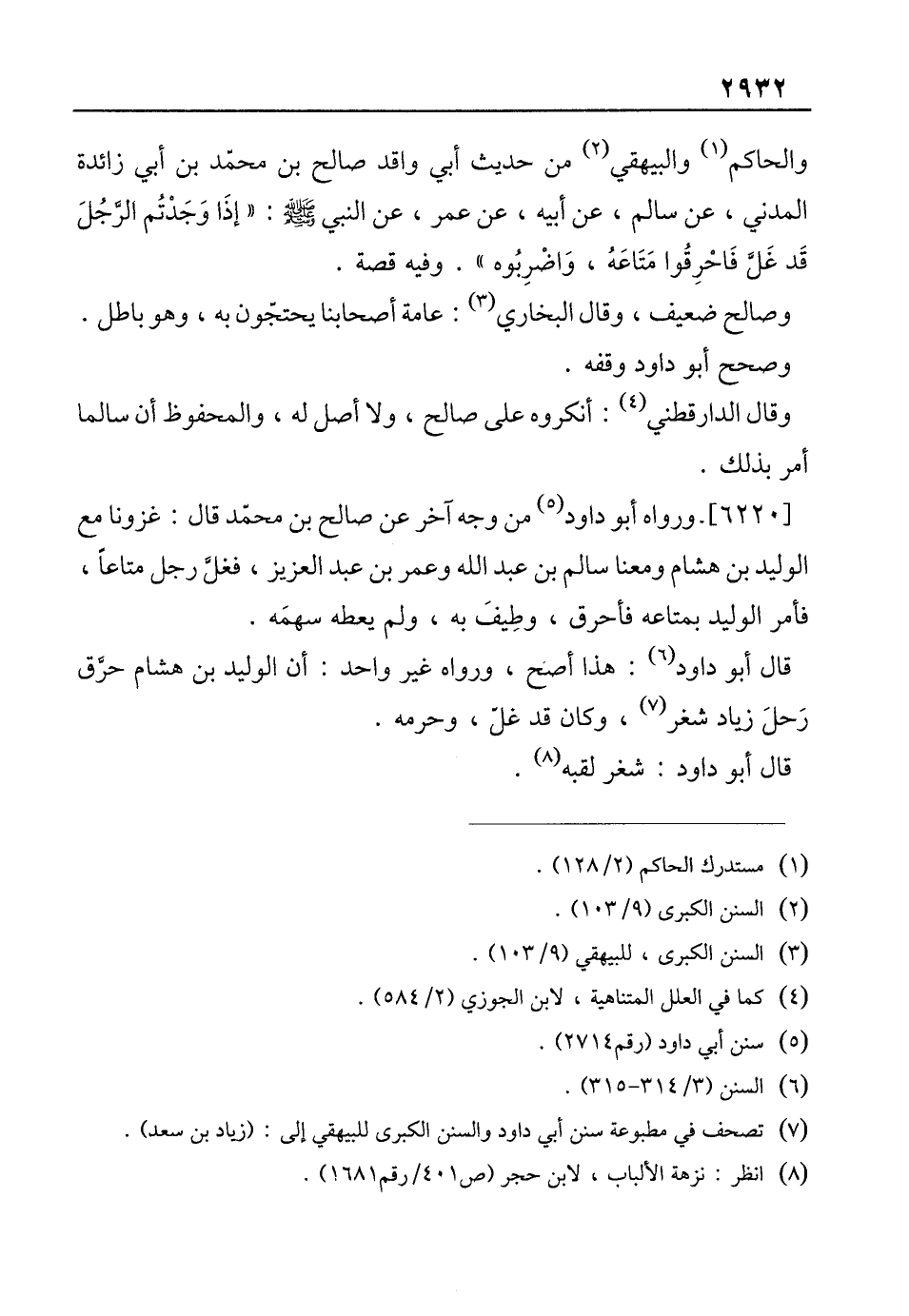 [6220]- ورواه أبو داود (¬5) من وجه آخر عن صالح بن محمّد قال: غزونا مع الوليد بن هشام ومعنا سالم بن عبد الله وعمر بن عبد العزيز، فغلَّ رجل متاعًا، فأمر الوليد بمتاعه فأحرق، وطِيفَ به، ولم يعطه سهمَه.